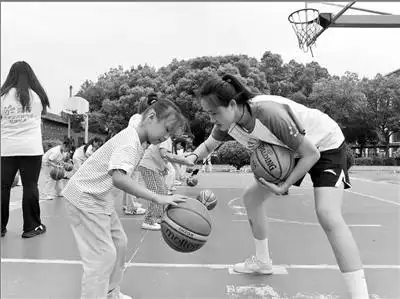 安徽师范大学“阳光体育”爱心夏令营实践团成员(右一)教小学生打篮球。朱海兵 摄