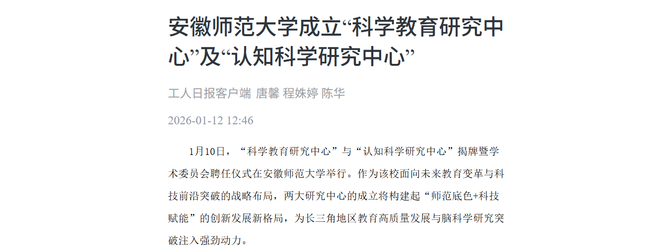 【工人日报客户端】安徽师范大学成立“科学教育研究中心”及“认知科学研究中心”
