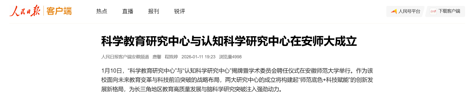 【人民日报客户端】科学教育研究中心与认知科学研究中心在安师大成立