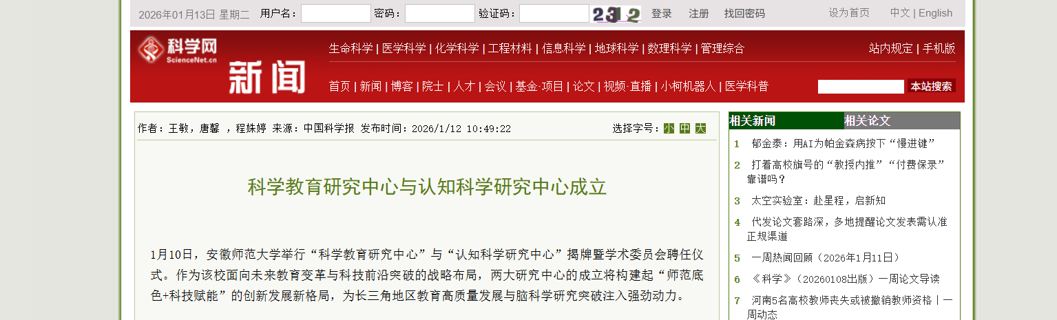 1月10日,安徽师范大学举行“科学教育研究中心”与“认知科学研究中心”揭牌暨学术委员会聘任仪式。作为该校面向未来教育变革与科技前沿突破的战略布局,两大研究中心的成立将构建起“师范底色+科技赋能”的创新发展新格局,为长三角地区教育高质量发展与脑科学研究突破注入强劲动力。