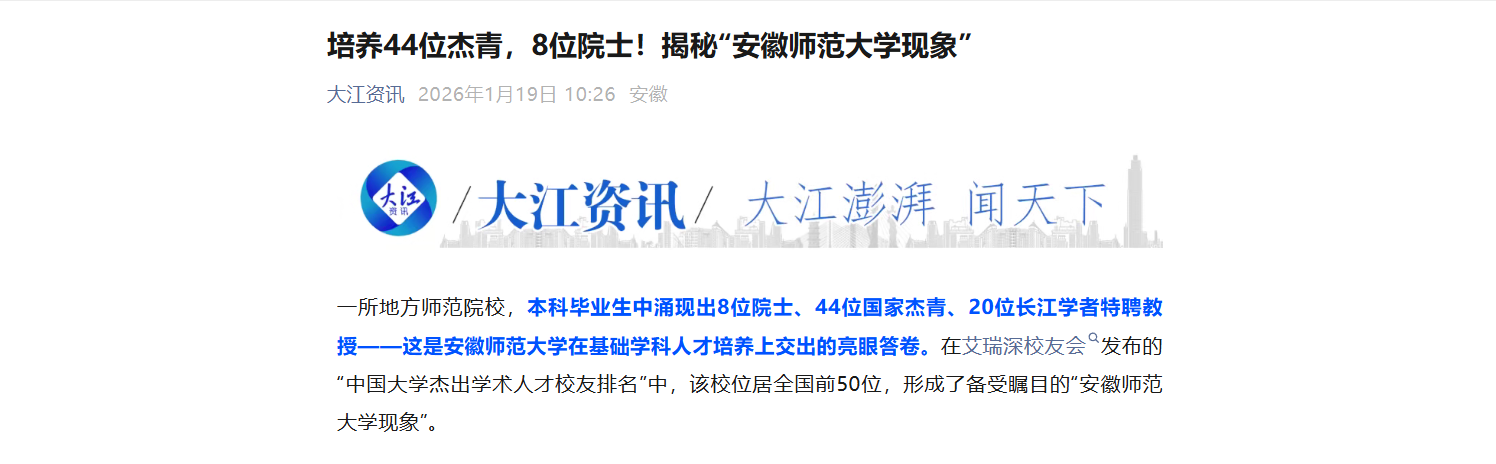 一所地方师范院校,本科毕业生中涌现出8位院士、44位国家杰青、20位长江学者特聘教授——这是安徽师范大学在基础学科人才培养上交出的亮眼答卷。在艾瑞深校友会发布的“中国大学杰出学术人才校友排名”中,该校位居全国前50位,形成了备受瞩目的“安徽师范大学现象”。