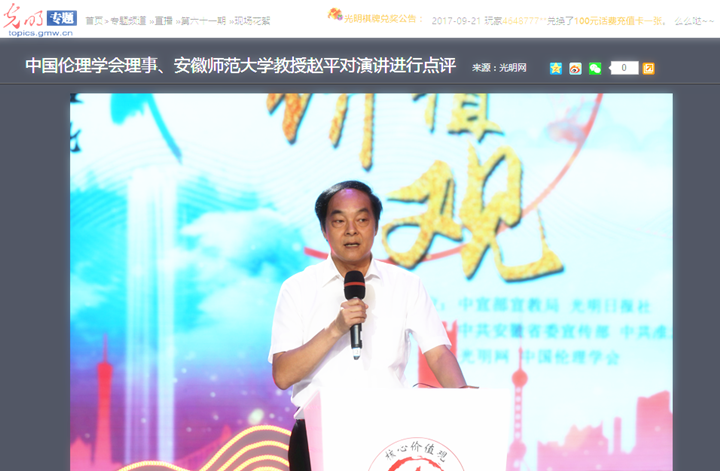 2017年9月19日,由中宣部宣教局、光明日报社共同主办的“核心价值观百场讲坛”第六十一场活动在安徽淮北举行。图为中国伦理学会理事、安徽师范大学教授赵平对演讲进行点评。(社梅月 黄鹤鸣)
