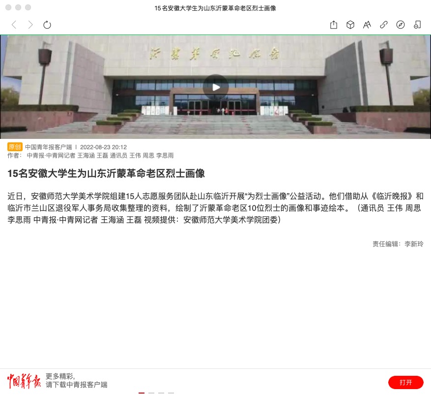 近日,安徽师范大学美术学院组建15人志愿服务团队赴山东临沂开展“为烈士画像”公益活动。他们借助从《临沂晚报》和临沂市兰山区退役军人事务局收集整理的资料,绘制了沂蒙革命老区10位烈士的画像和事迹绘本。