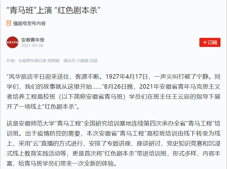 “当下,‘剧本杀’在年轻人圈子里是最为流行一种社交游戏。将它带到培训班来,是我们今年的一次破冰活动,主要还是为了推进内容、形式和方法的创新。”据安徽师范大学团委副书记廖仲明介绍,与传统的“剧本杀”不同的是,这次学员们将在破案过程中走近党史,探寻百年大党的红色密码。