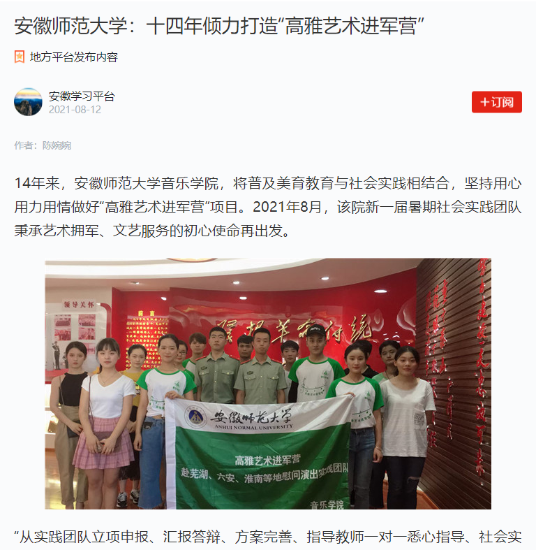 14年来,安徽师范大学音乐学院,将普及美育教育与社会实践相结合,坚持用心用力用情做好“高雅艺术进军营”项目。2021年8月,该院新一届暑期社会实践团队秉承艺术拥军、文艺服务的初心使命再出发。