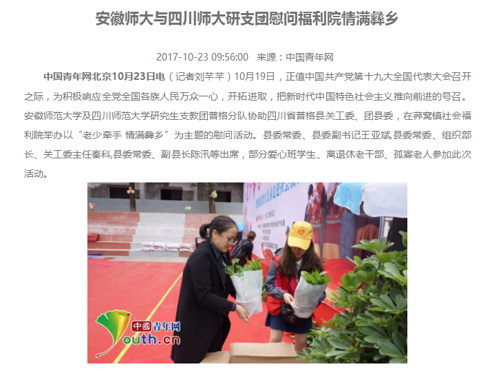 10月19日,正值中国共产党第十九大全国代表大会召开之际,为积极响应全党全国各族人民万众一心,开拓进取,把新时代中国特色社会主义推向前进的号召。安徽师范大学及四川师范大学研究生支教团普格分队协助四川省普格县关工委、团县委,在荞窝镇社会福利院举办以“老少牵手 情满彝乡”为主题的慰问活动。县委常委、县委副书记王亚斌,县委常委、组织部长、关工委主任秦科,县委常委、副县长陈汛等出席,部分爱心班学生、离退休老干部、孤寡老人参加此次活动。