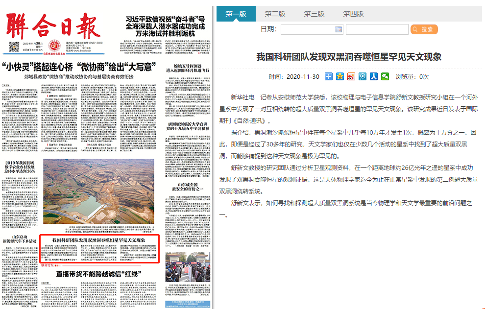 记者从安徽师范大学获悉,该校物理与电子信息学院舒新文教授研究小组在一个河外星系中发现了一对互相绕转的超大质量双黑洞吞噬恒星的罕见天文现象。该研究成果近日发表于国际期刊《自然·通讯》。