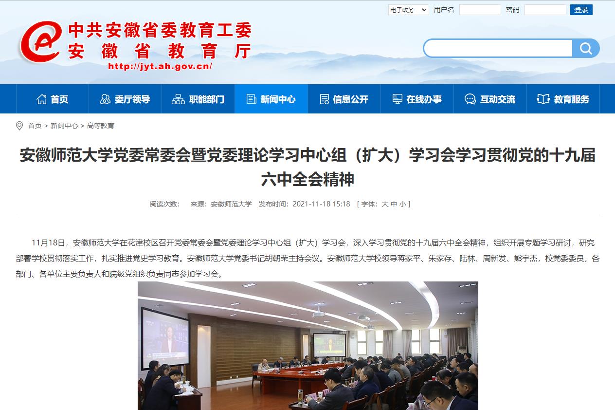 11月18日,安徽师范大学在花津校区召开党委常委会暨党委理论学习中心组(扩大)学习会,深入学习贯彻党的十九届六中全会精神,组织开展专题学习研讨,研究部署学校贯彻落实工作,扎实推进党史学习教育。安徽师范大学党委书记胡朝荣主持会议。安徽师范大学校领导蒋家平、朱家存、陆林、周新发、熊宇杰,校党委委员,各部门、各单位主要负责人和院级党组织负责同志参加学习会。