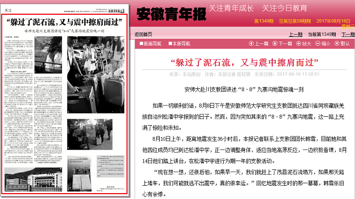 同陈骁一样,安徽师范大学的领导同样关心着研究生支教团的安危,校团委书记梁燕一边向领导汇报情况,一边安慰支教团成员,叮嘱大家要提高警惕,防止余震和次生灾害;校学生工作处在第一时间发出呼吁和建议,告知全体学生,尤其是新疆籍、四川籍及正在震区周边旅游、探亲访友的学生们,如遇困难可拨打震区应急救援电话,时刻保持人生和财产安全。该校共青团官方微信也在第一时间转发,叮嘱大家不信谣、不传谣,不盲目自行去震区帮忙,听从政府的指挥和号召。
