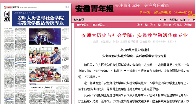 其实,惊讶的何止是这位考官?在很多人的印象中,社会工作学专业是枯燥乏味的,缺乏新意。然而,近年来,该校历史与社会学院大胆创新,盘活传统专业的教学资源,改革教学方式,不仅将课堂教学搬到田间地头、工厂古迹,还将停断十多年的实践教学重拾起来,通过第二、第三课堂活动,将实践教学与专业能力培养紧密结合。与此同时,鼓励学生大胆参与教师的课题研究,参加各项校内外比赛。这些正逐渐让传统专业再焕新颜。