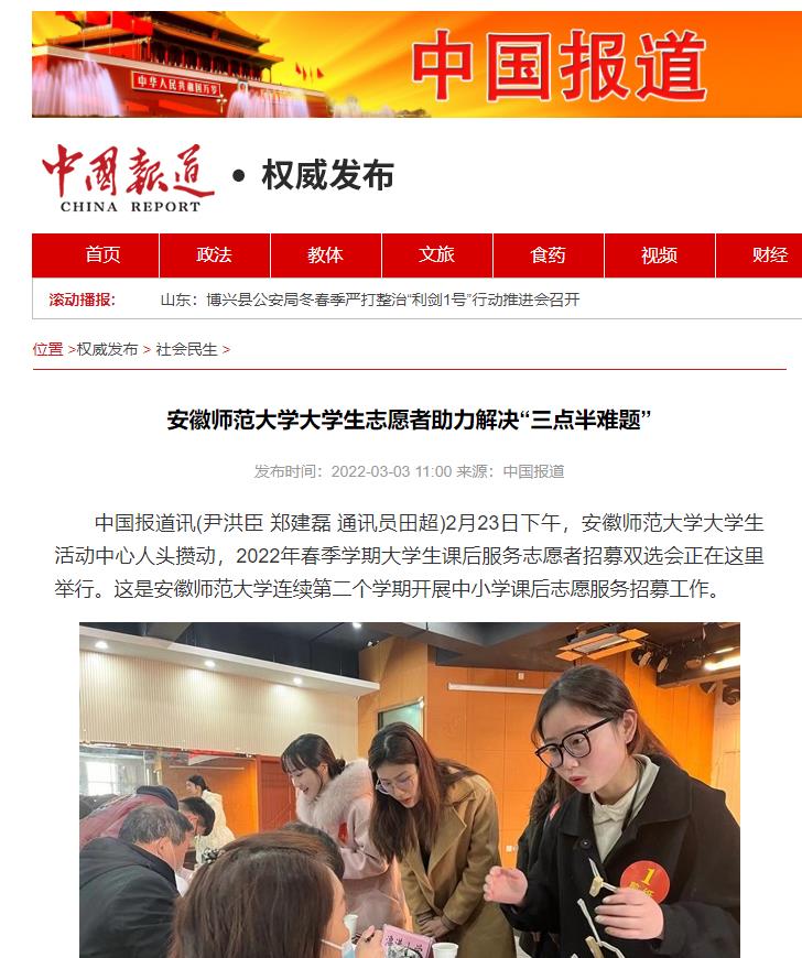自教育部发布“双减”政策以来,课后服务师资少一直是困扰地方教育部门的一大难题。安徽师范大学作为综合性地方高水平大学,优质的学生资源成为解决“三点半难题”的重要助力。2021年10月,学校积极配合芜湖市教育局、团市委,成为首批课后服务“合伙人”(全市仅2所高校入选)。通过定向遴选的53名大学生志愿者,共在6所中小学承担了体育、舞蹈、器乐、合唱、国画、科普、演讲等课后服务课程,累计开展志愿活动约583小时,服务中小学生约4000余人次,成为芜湖市推进落实“双减”政策的重要力量。