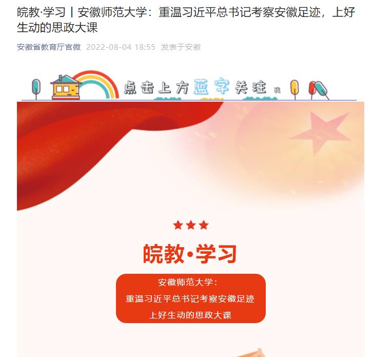 日前,教育部思想政治工作司开展了“青春献礼二十大 强国有我新征程”主题宣传教育活动,在工作方案中,重点部署了征集“高校师生寻访重温习近平总书记重要考察足迹学习分享活动”优秀成果展宣传推广素材,安徽师范大学根据教育部、省教育厅相关要求,结合学校大学生暑期“三下乡”社会实践活动开展情况,围绕“师生践行嘱托的主要成果”,梳理征集了学校师生开展学思践悟、学习分享活动的相关素材,并在学校官微推出“寻访重温习近平总书记重要考察足迹学习分享活动优秀成果展示”栏目,讲述师大寻访重温总书记重要考察足迹,践行嘱托这十年。